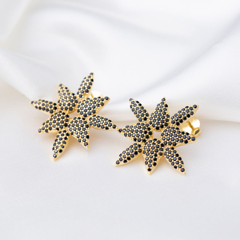 Flower Design Round Cut Black Zircon Stone Stud Earring Turkish Wholesale Handmade 925 Sterling Silver Jewelry