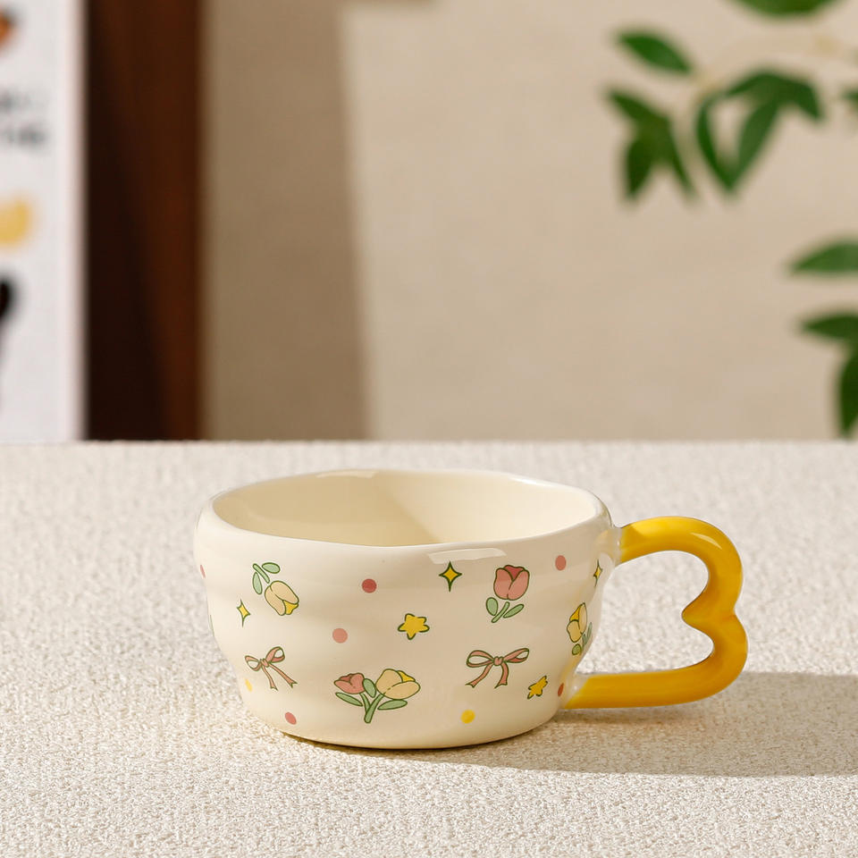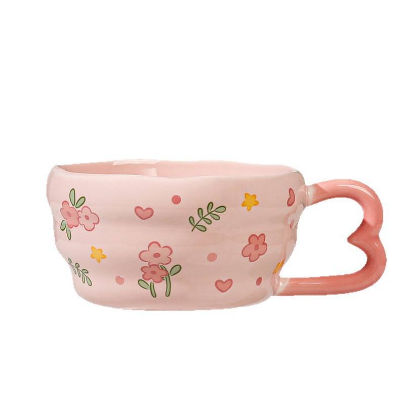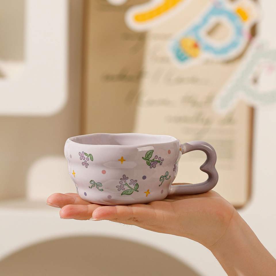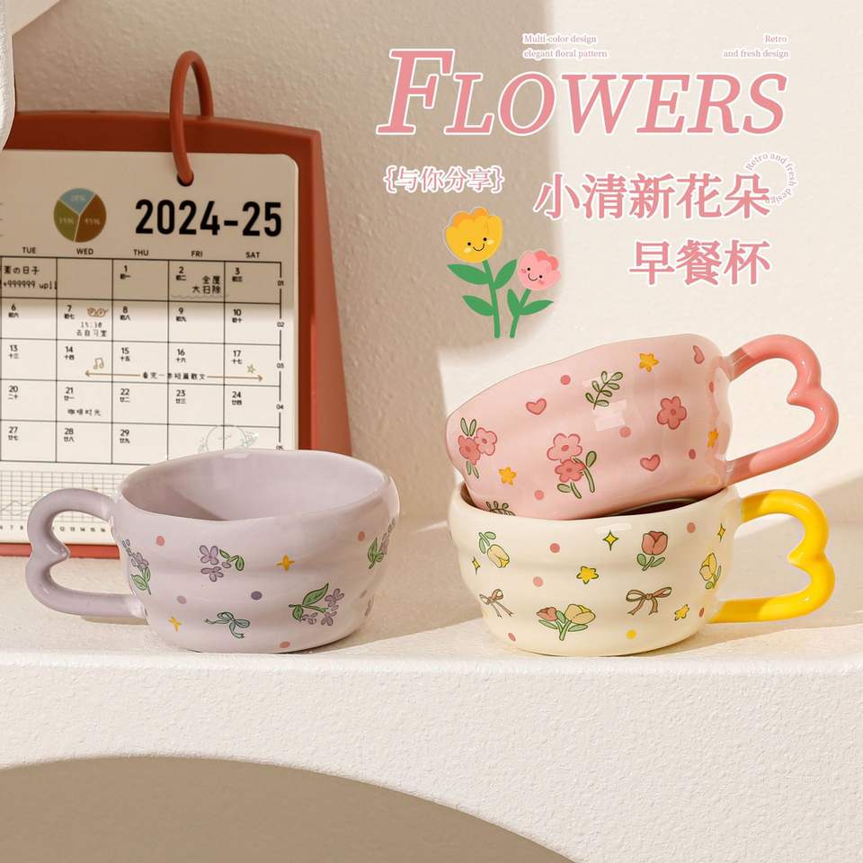 Flower Pattern Ceramic Mug With Handle Pink Purple Yellow Cartoon Design For Breakfast Gift Spring 2025 Single Cup