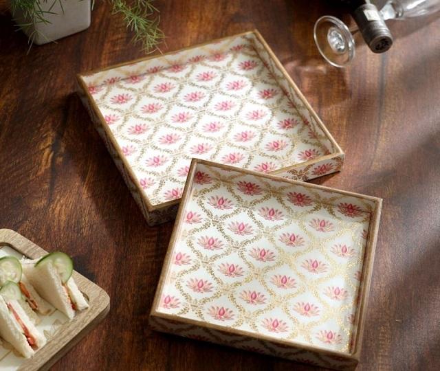 Flower Pattern Print Round Coffee Snack Serving Tray Set MDF Wooden Table Decorations with Handle from f s international