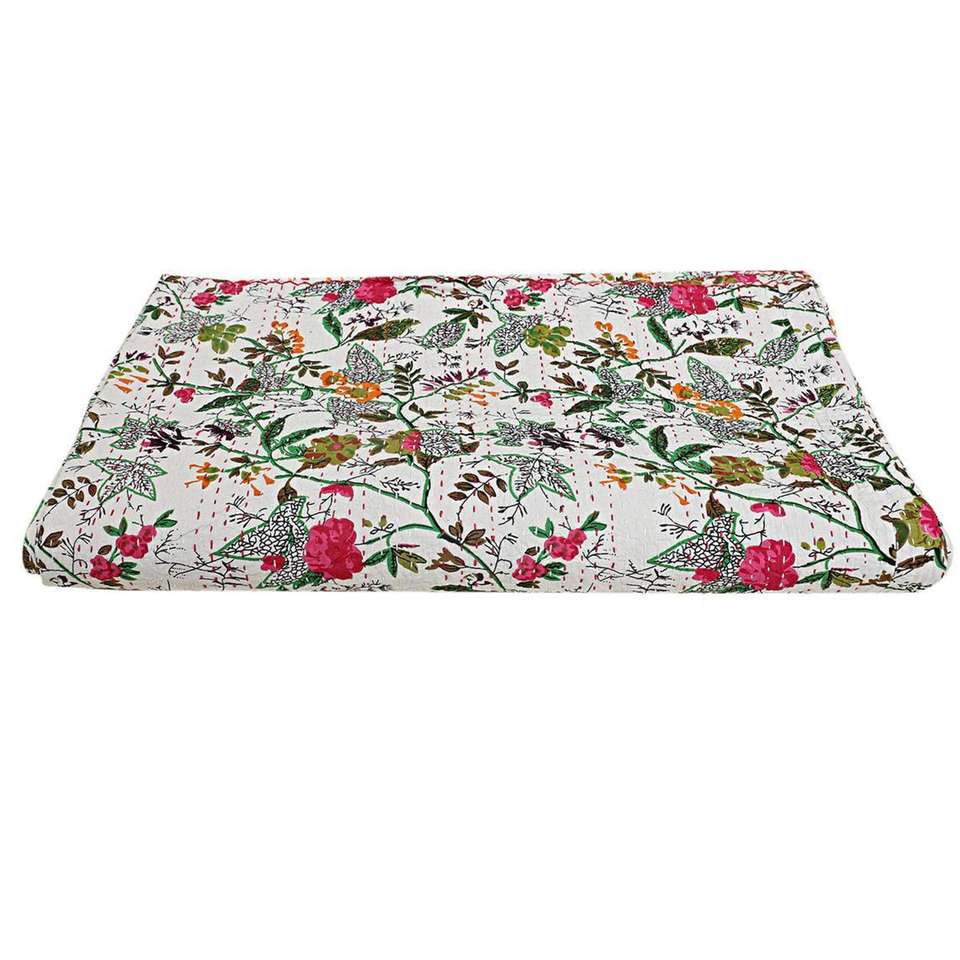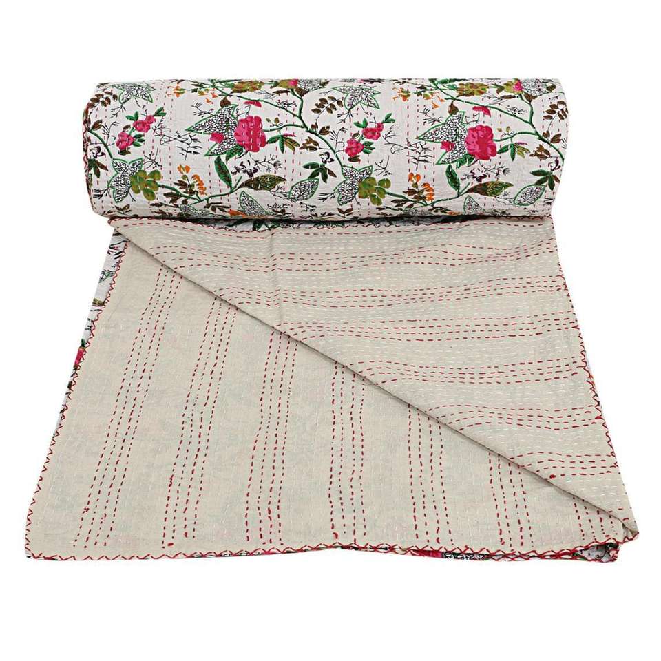 Flower Print Kantha Bed Quilt Vintage Indian Traditional Custom Made 100% Cotton Eco-friendly Handmade Reversible Quilt