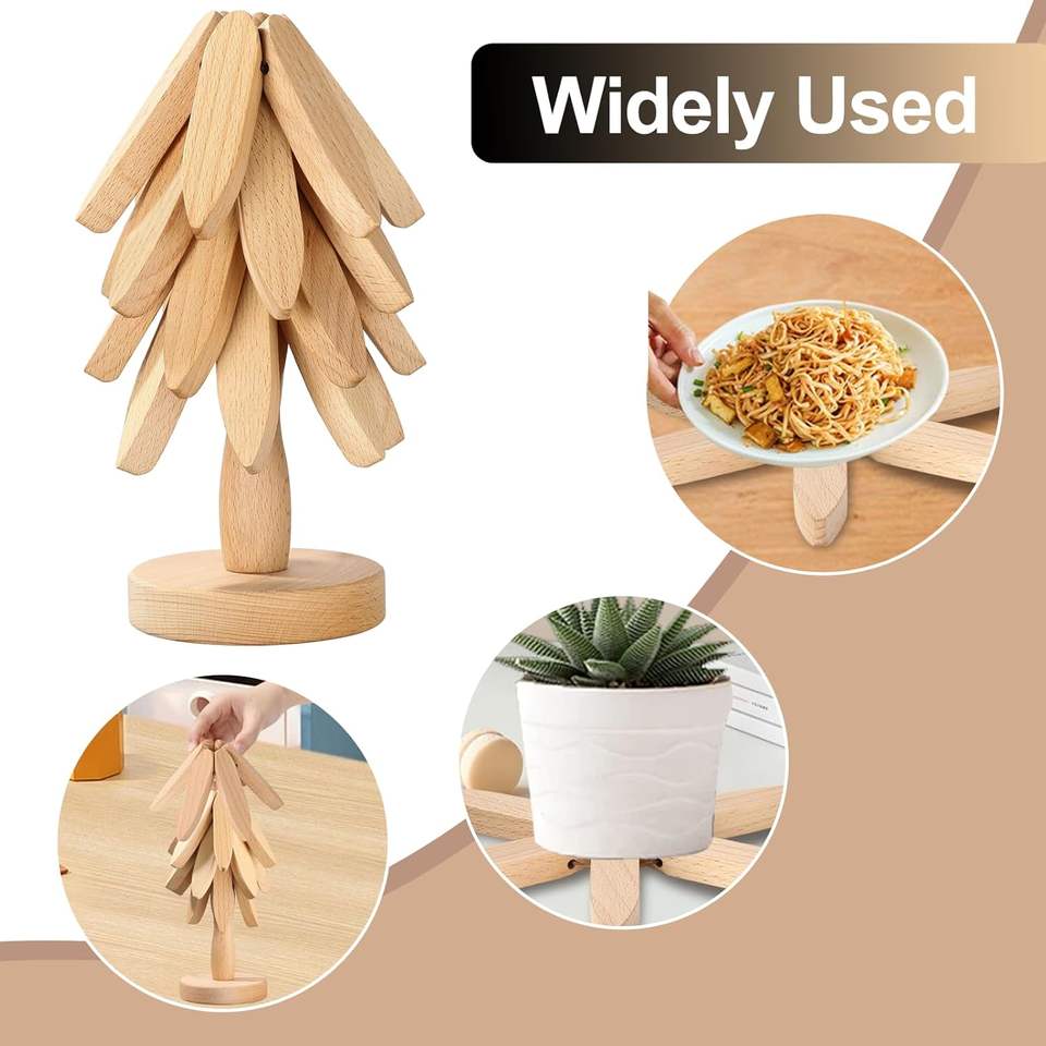 Foldable Heat Resistant Pads Kitchen Table Wooden Trivets for Hot Dishes with 4 Beech Wood Hot Plate Mats Tree Shape Trivet Set