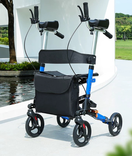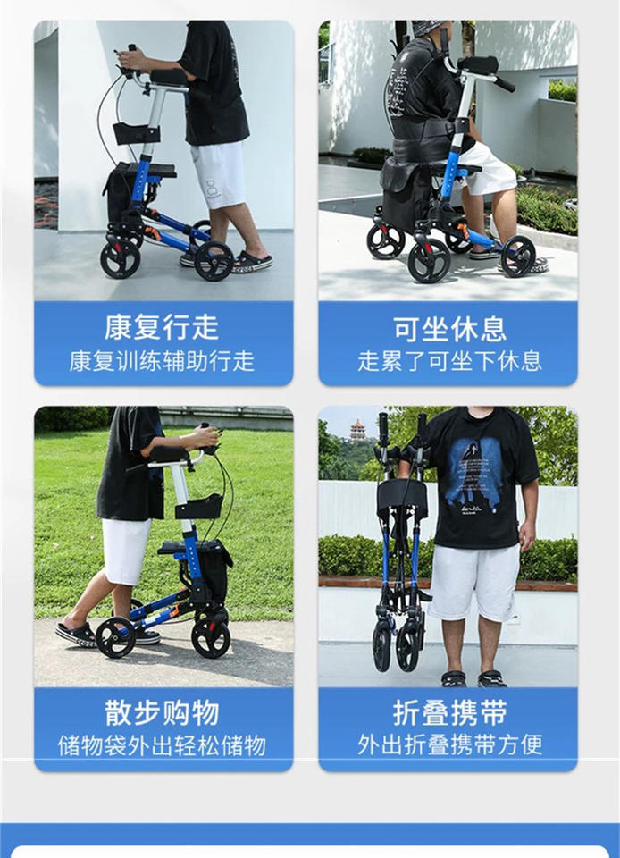 Foldable elderly walker with shopping basket manual push walker lightweight mobility aid with seat