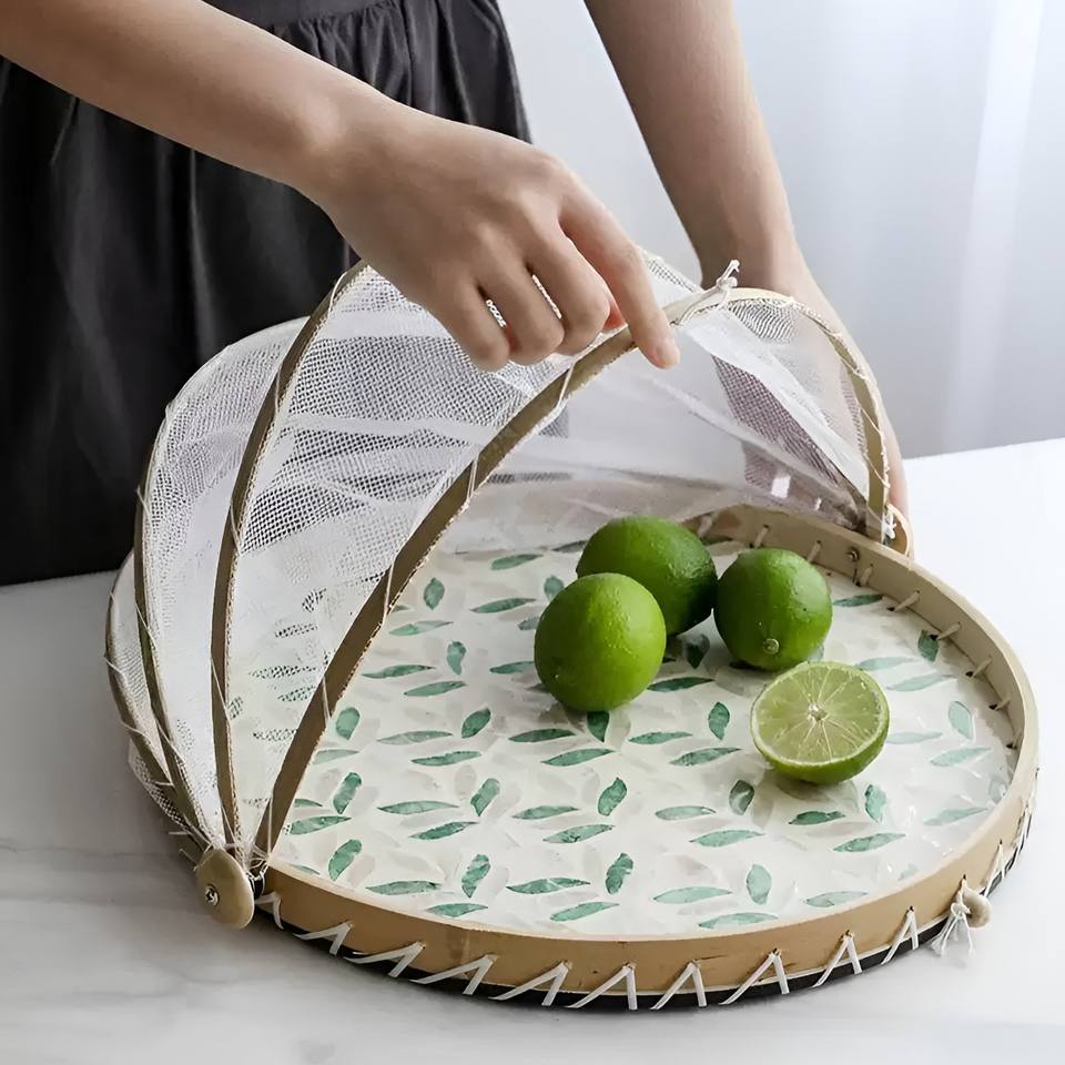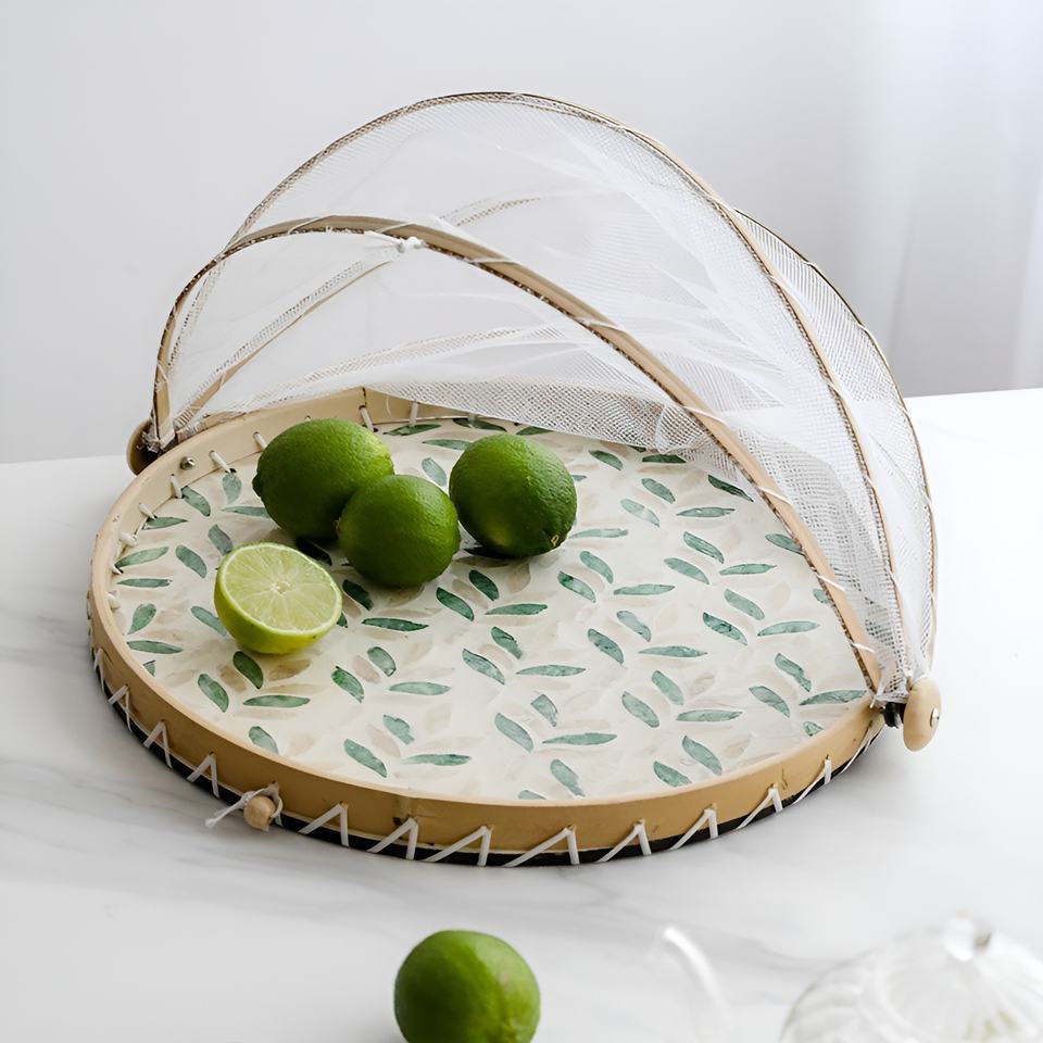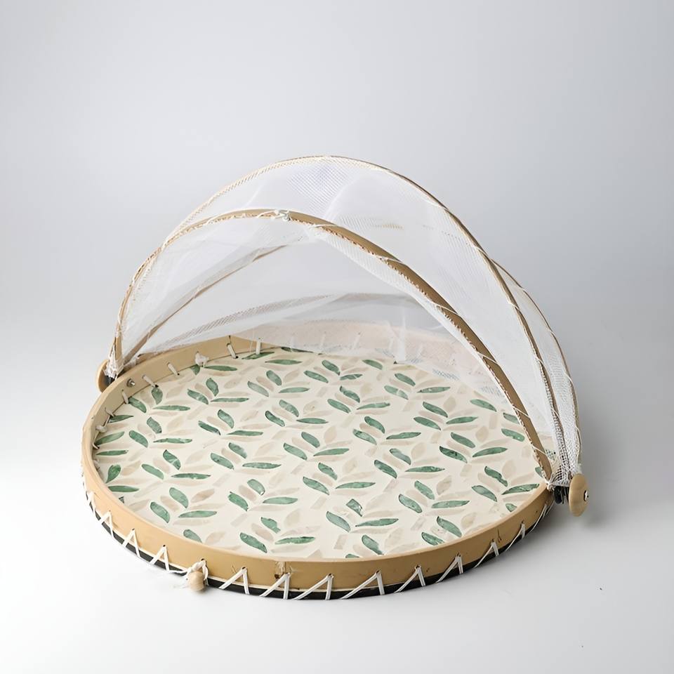 Food protection MOP inlaid tray with cover mesh handmade pearl shell dust covers wholesale pricing