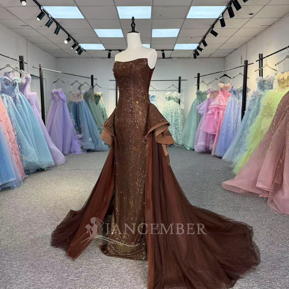 For 1342 Glitter Brown Scoop Mermaid Floor-Length Evening Party Overskirt Beading Embroidery Appliques Print Natural Waist