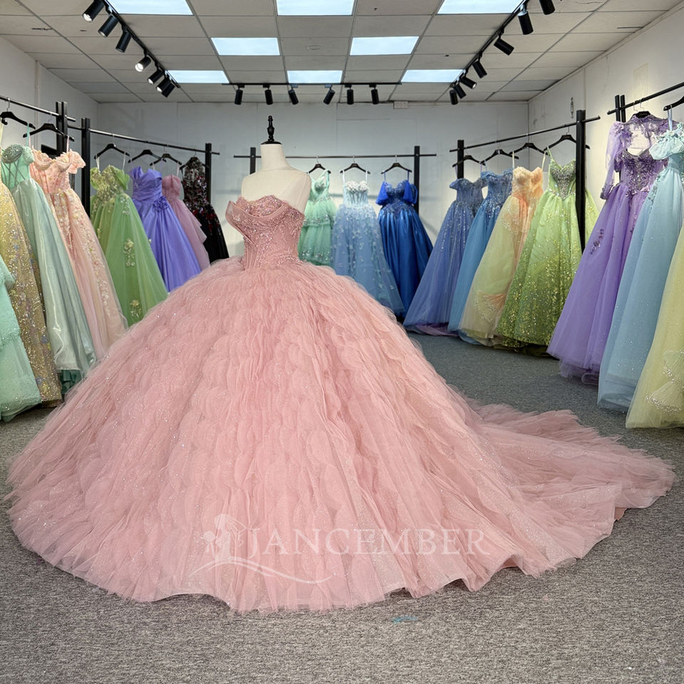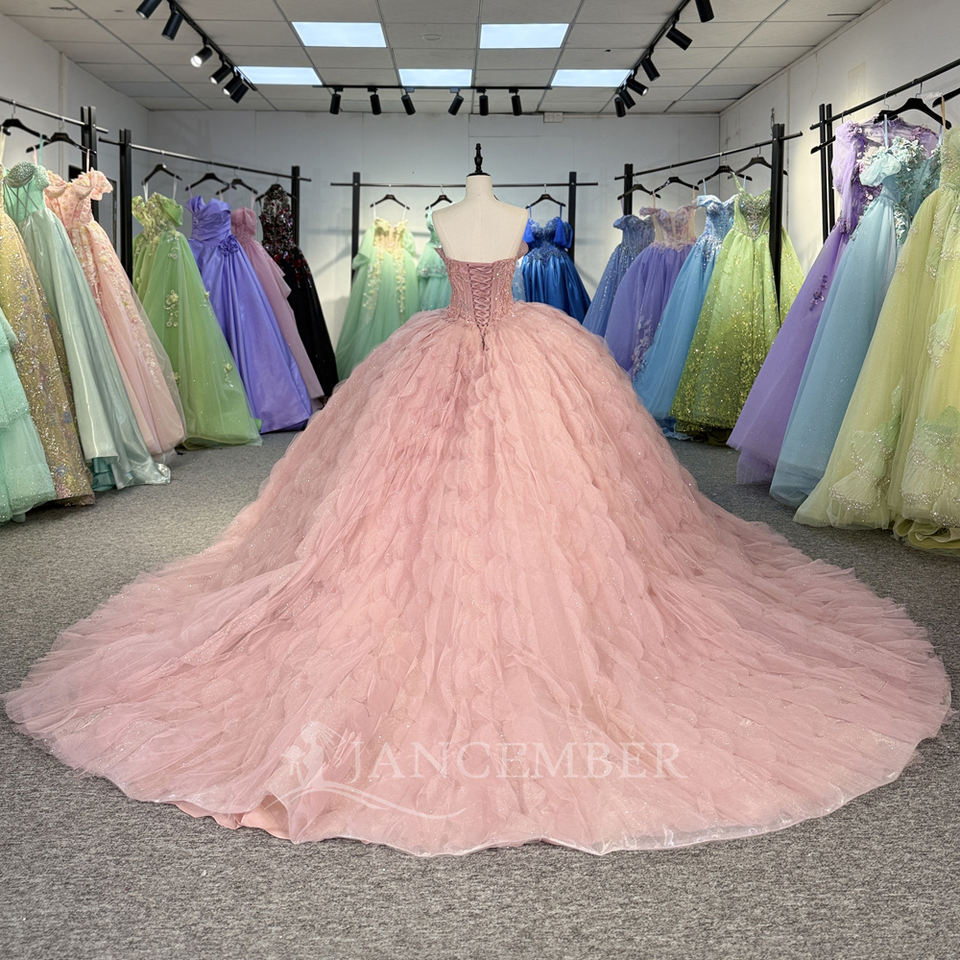 For 6845 Stylish Pink Beading Appliques Crystal Natural Waistline Quinceanera Ball Gown Dresses for Birthday Ceremony