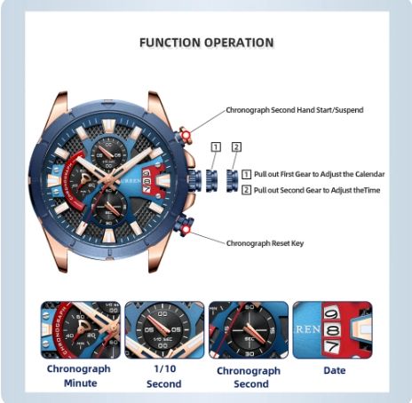 Feature:Water Resistant, Auto Date, Complete Calendar, chronograph, Day/Date, Waterproof