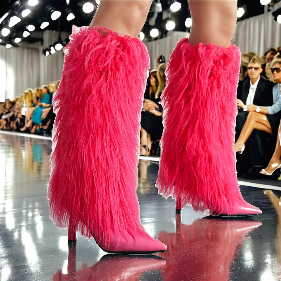 For Busy Girl H4612 Women's Winter Knee High Boots Big Size 14 High Heels Fashion Fluffy Furry Black Hot Pink Faux Fur Snow