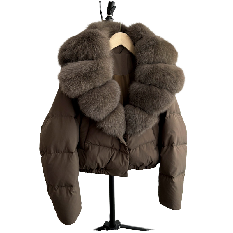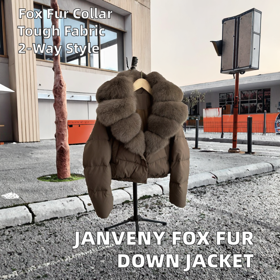 For JANVENY Reversible Women's Winter Short Waterproof PU Puffer Coat Large Natural Fox Fur Collar Thick 90% White Duck Jacket