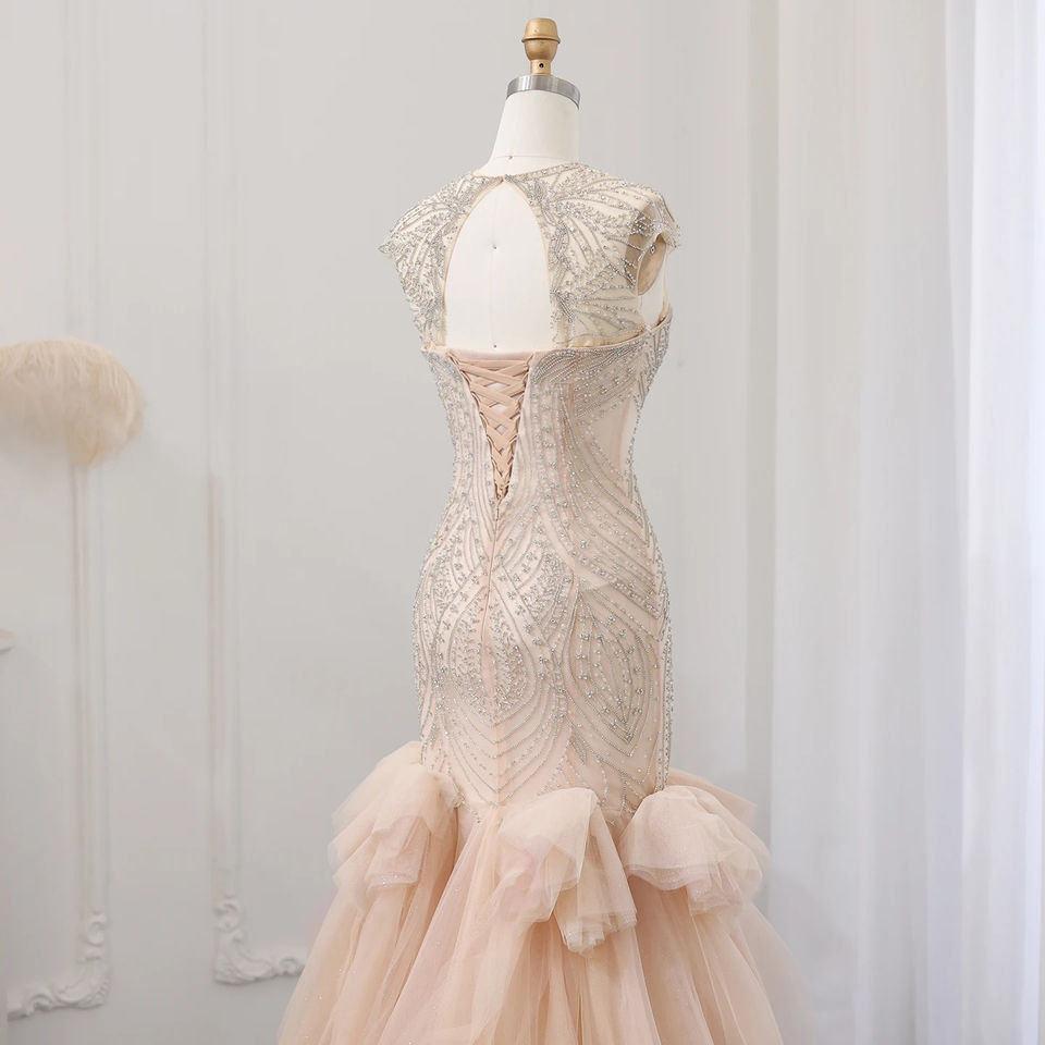For Jancember SZ509 Traditional Sleeveless Mermaid Evening Party Dresses Beaded Sequins Feathers Pleats 3D Pattern Natural