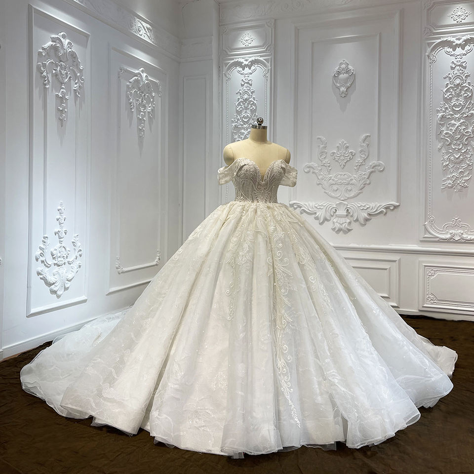 For LSCJ09 Modern Floral Crystal Appliques Lace Fabric Tulle Floor-Length Bridal Wedding Ball Gown Dresses Court Train
