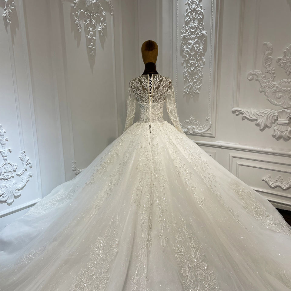For LSCJ30 Elegant Long Sleeve Modern Bridal Wedding Ball Gown Dress with Chapel Train Lace Crystal Appliques