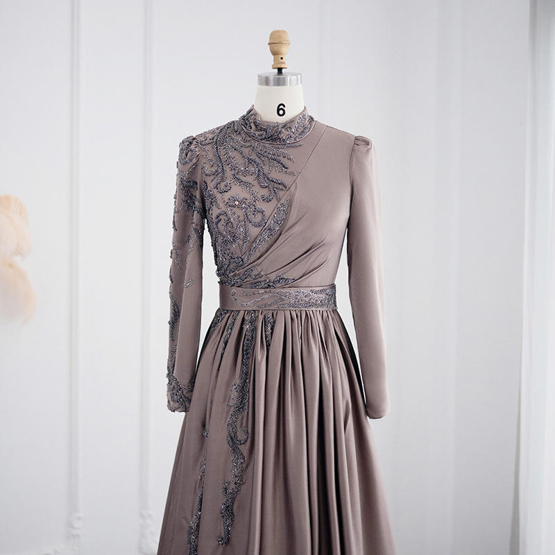 For LSCZ173 Stylish Brown 3D Crystal Ruched Pattern High Neck Full Sleeve Floor-Length Natural Waist Satin Muslim 2023 Party