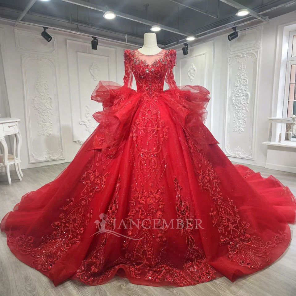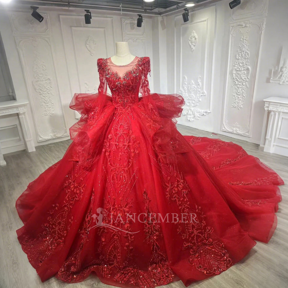 For LSLM04 Classic Red Long Sleeve Yarn Evening Crystal Floor-Length Ball Gown Party Organza Pleat Women's Dresses