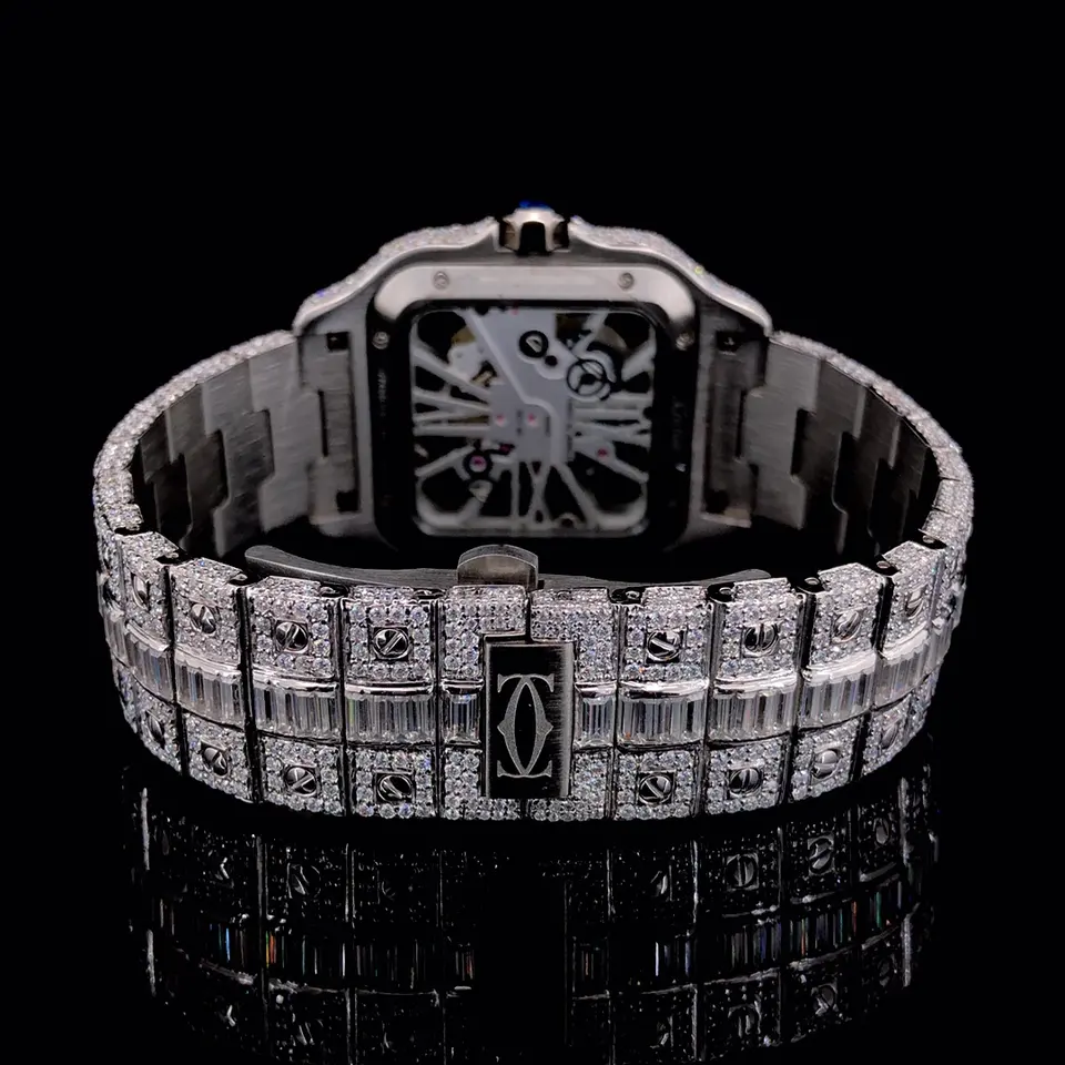 For Luxury Skeleton Silver Men's Watch Baguette Diamond Stainless Steel Band Square Case Butterfly Clasp Quartz Movement