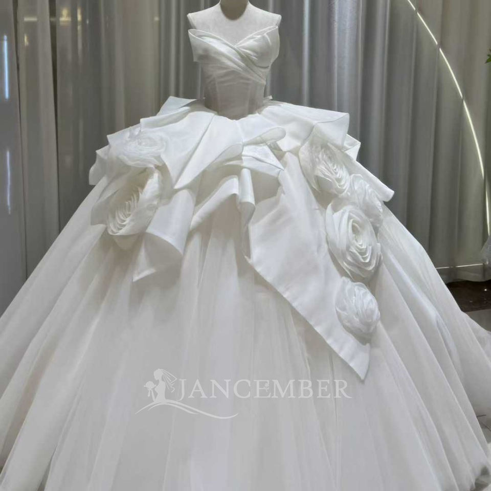 For OY026 Modern Long Sleeveless Sweetheart Lace Crystal Appliques Satin Wedding Puffy Dress with 3D Flower