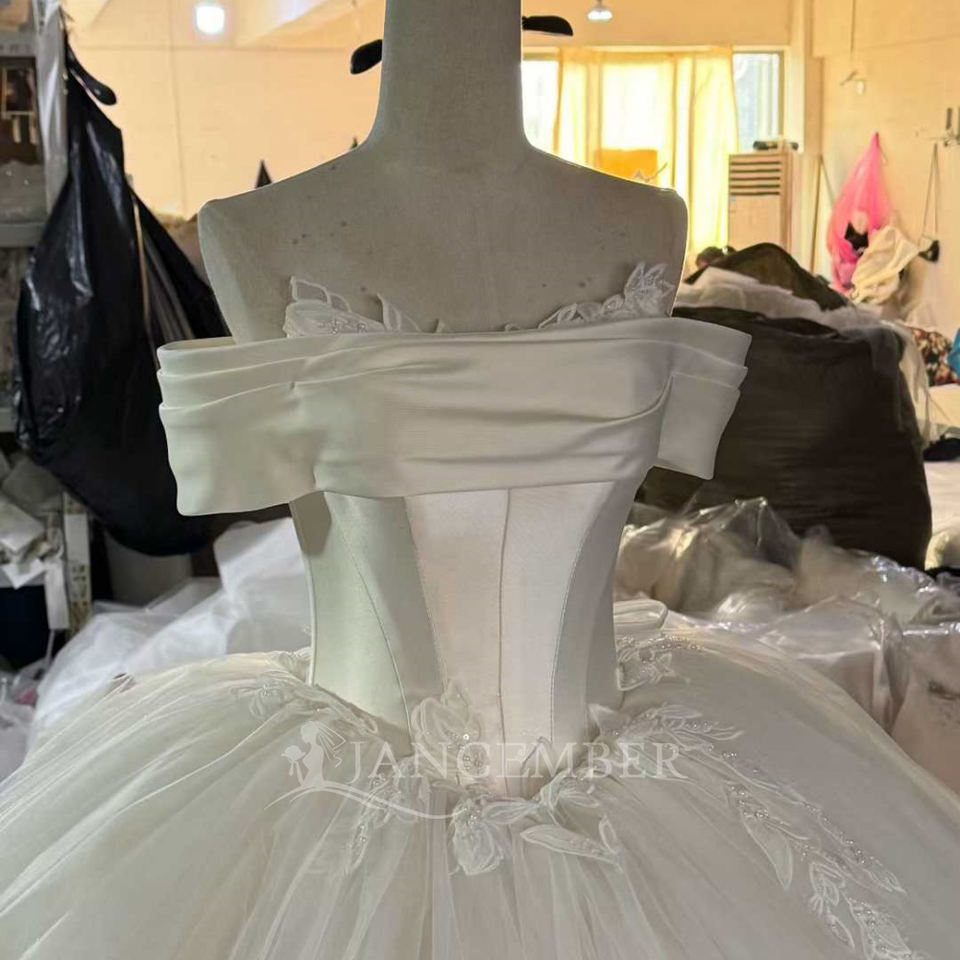 For OY041 Modern Boat Neck Satin Tulle Fabric Wedding Ball Gown Chapel Train Floral Crystal Appliques Lace