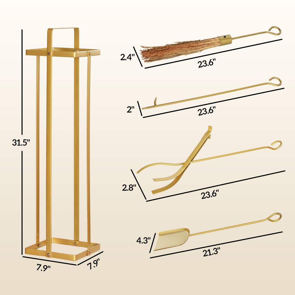 For Heavy-Duty 5-Piece Fireplace Tools Set Indoor & Outdoor Metal Accessories Gold Stand Chimney Broom Poker Tongs