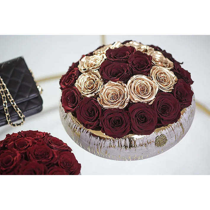 Preserved roses,Ceramic bowl,Mat-gray finish,Gold drizzle