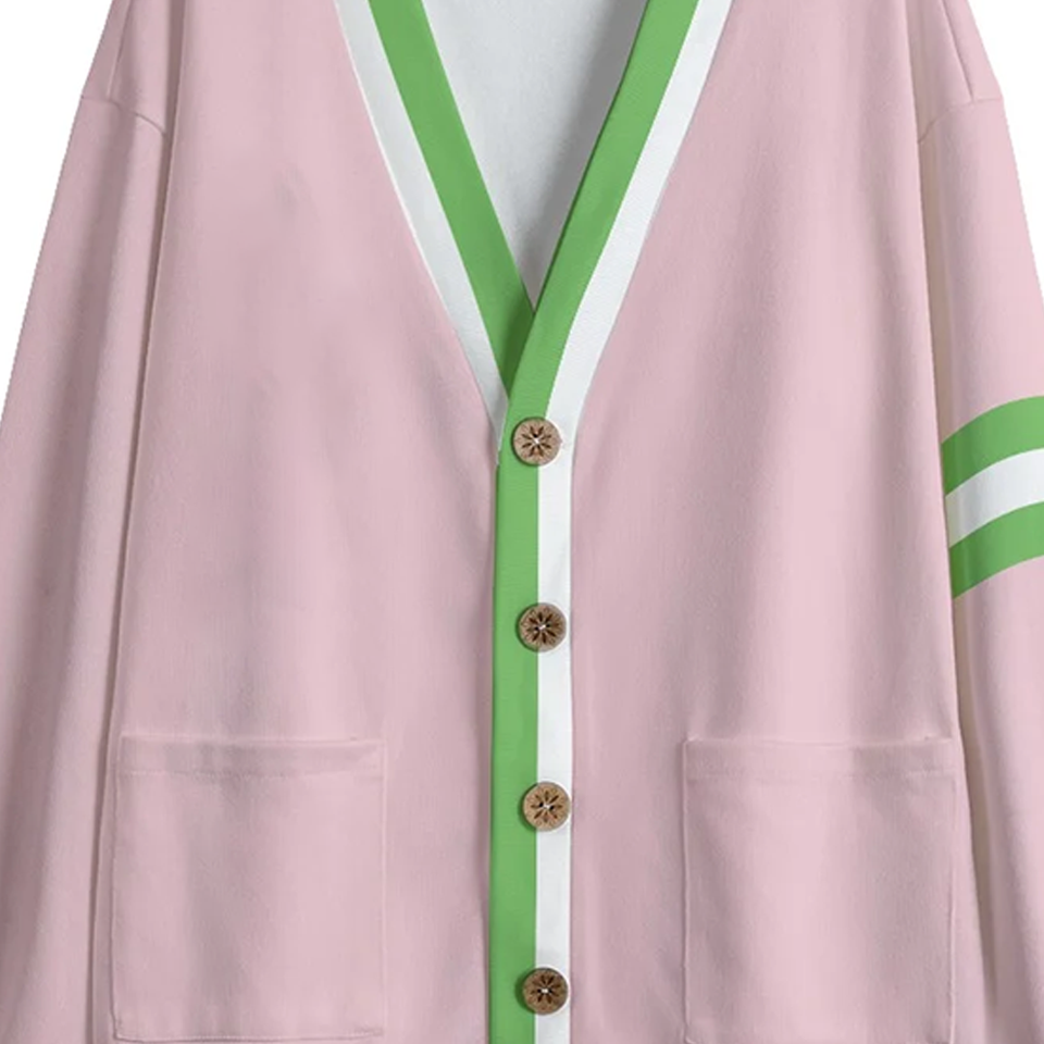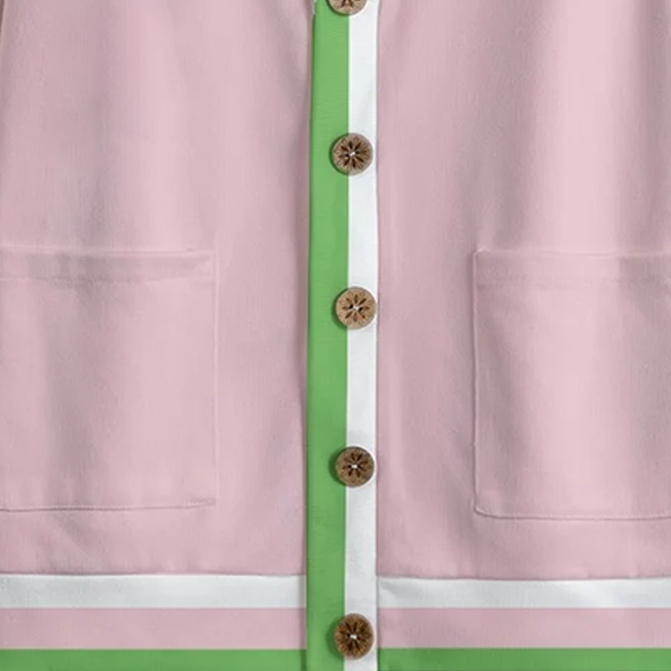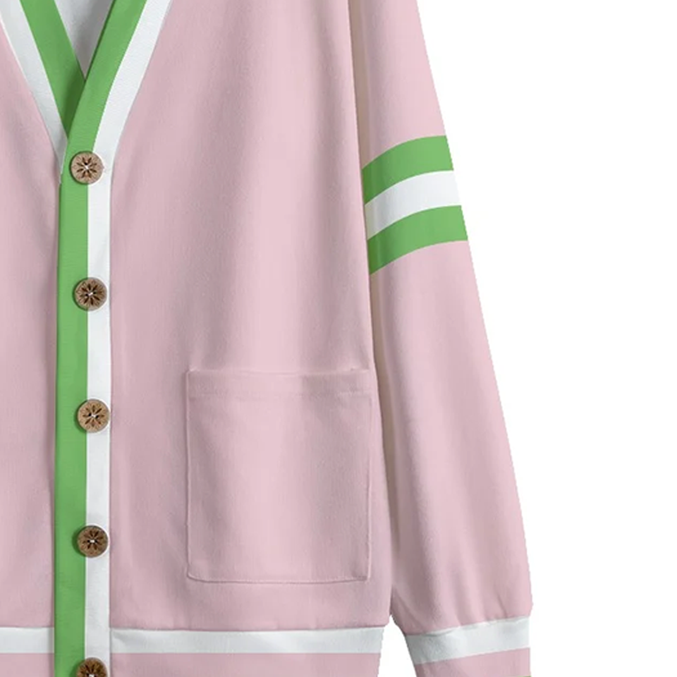For Winter Casual Salmon Pink & Apple Green V Neck Knitted Fleece Cardigan Cozy Button Front Sorority with Stripe Accent