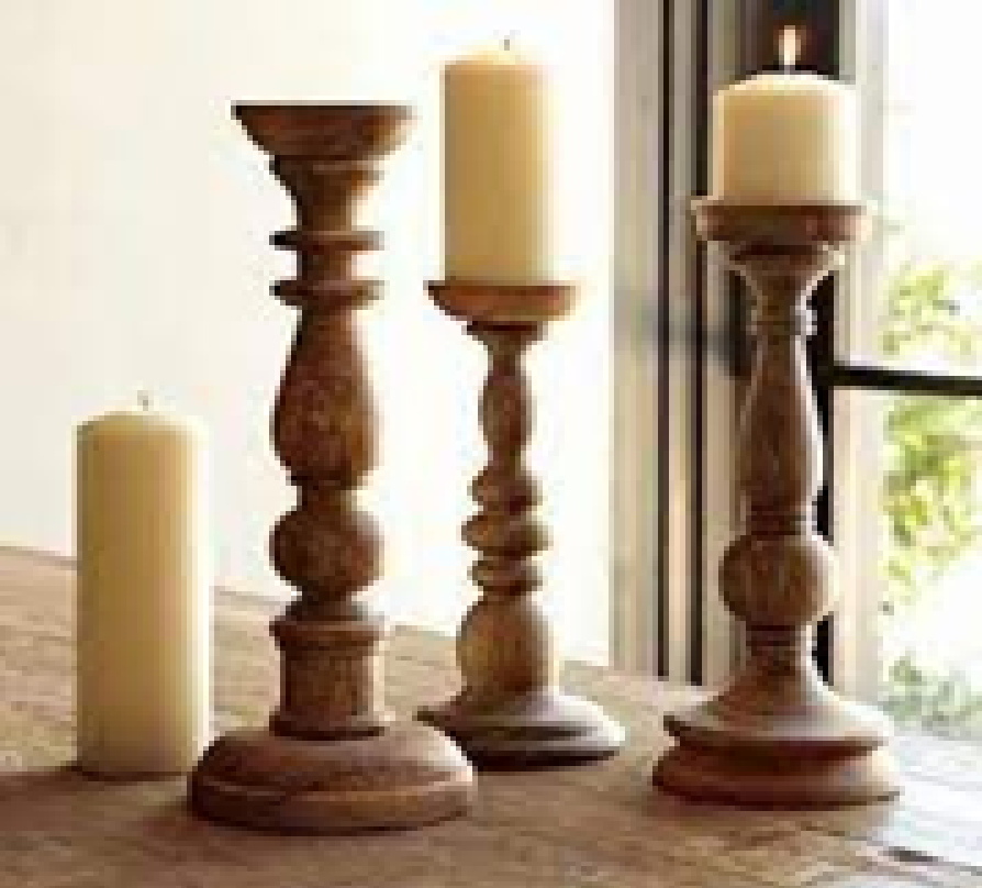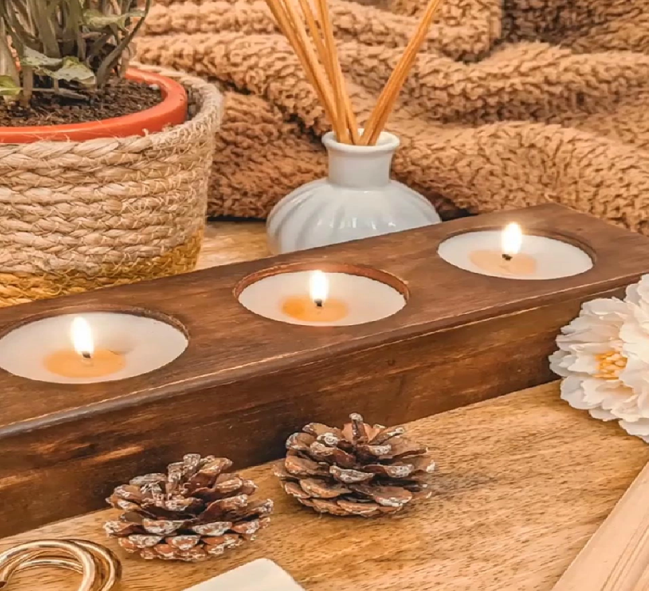 Four square, minimalist wooden candle holders with white tops, each holding a small tea light, are artfully arranged.