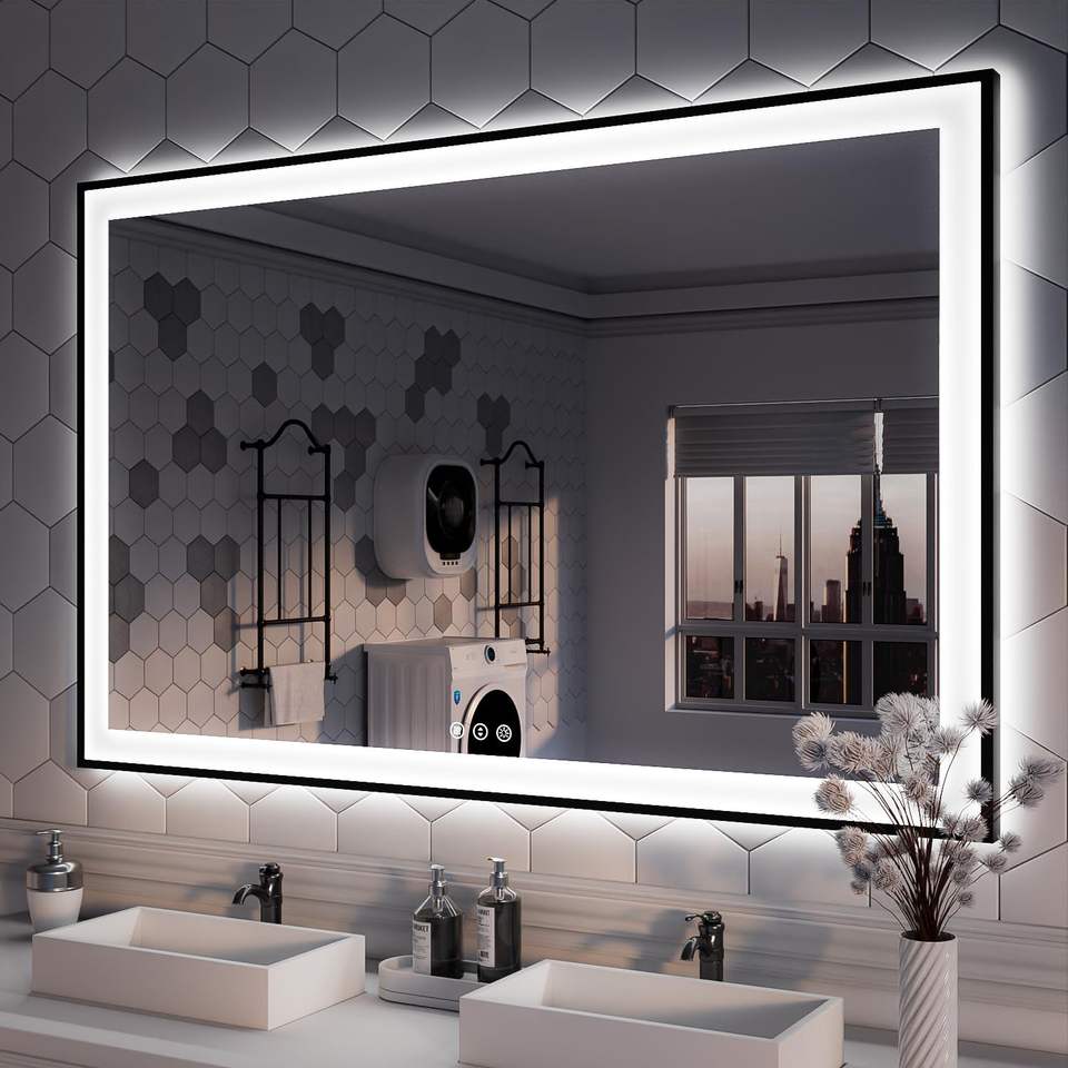 Framed Black Square Mirror Anti-fog Bathroom Mirror Mirror Touch Screen LED Wall Mount Hotel Project Smart Wall Mount with Light