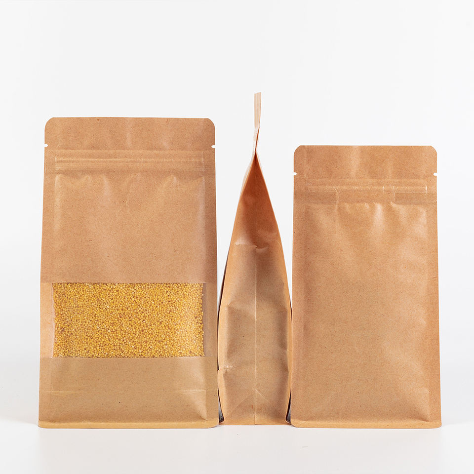 Free Sample Stock Block Bottom Paper Bags for Tea Ziplock Eight Side Seal Bag Nut Food Brown Kraft Paper Bags With Clear Window