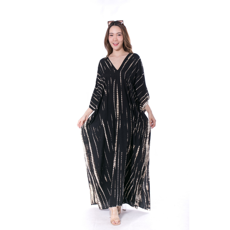 Free Size Printed Pattern Tie Dye Summer Dress Women Casual Stripe Batwing Plus Size Boho Clothing in Black Color