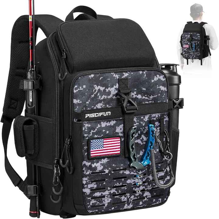 Free sample Fishing Tackle Backpack, 48L Large Fishing Bag with Rod Holders, 4 Tackle Box and Protective Rain Cover