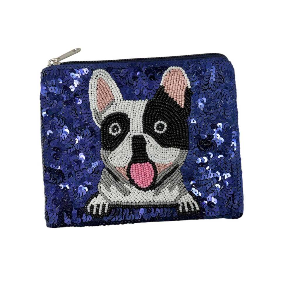 French Bulldog Beaded Zipper Pouch Blue Clutch Cute Pet Lover Purse Storage Trendy Fashion Accessory Gift Women