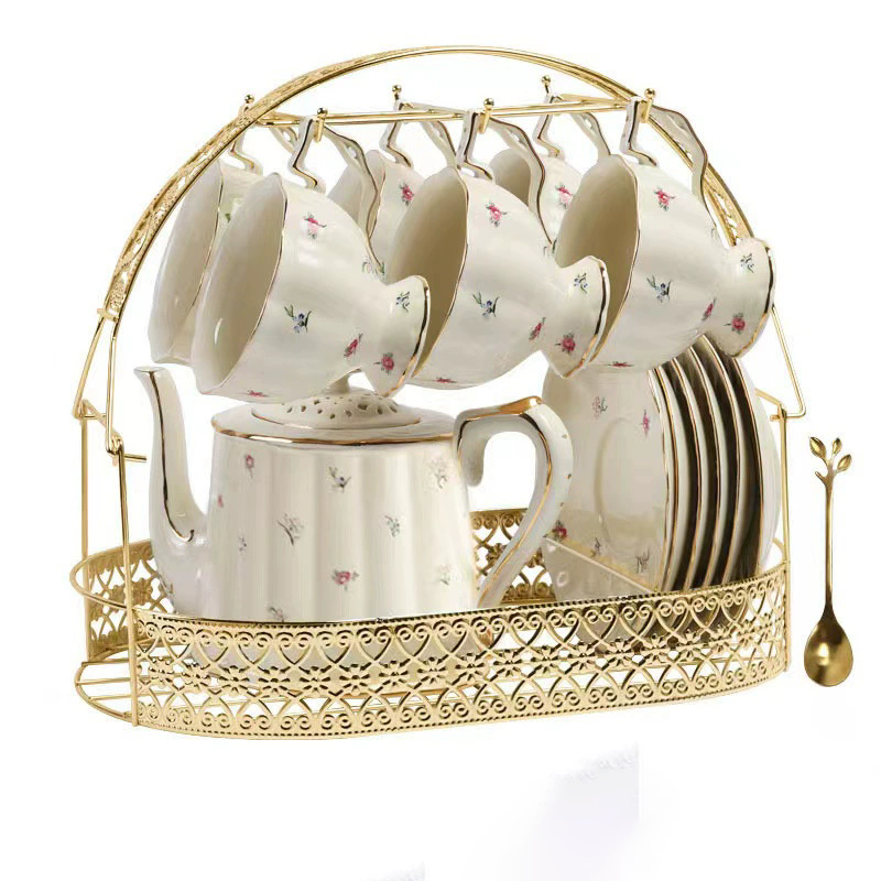 French Handpainted Gold Rims Flower Ceramic Coffee and Tea Sets of Two Cups and Saucers Porcelain Coffee Teapot