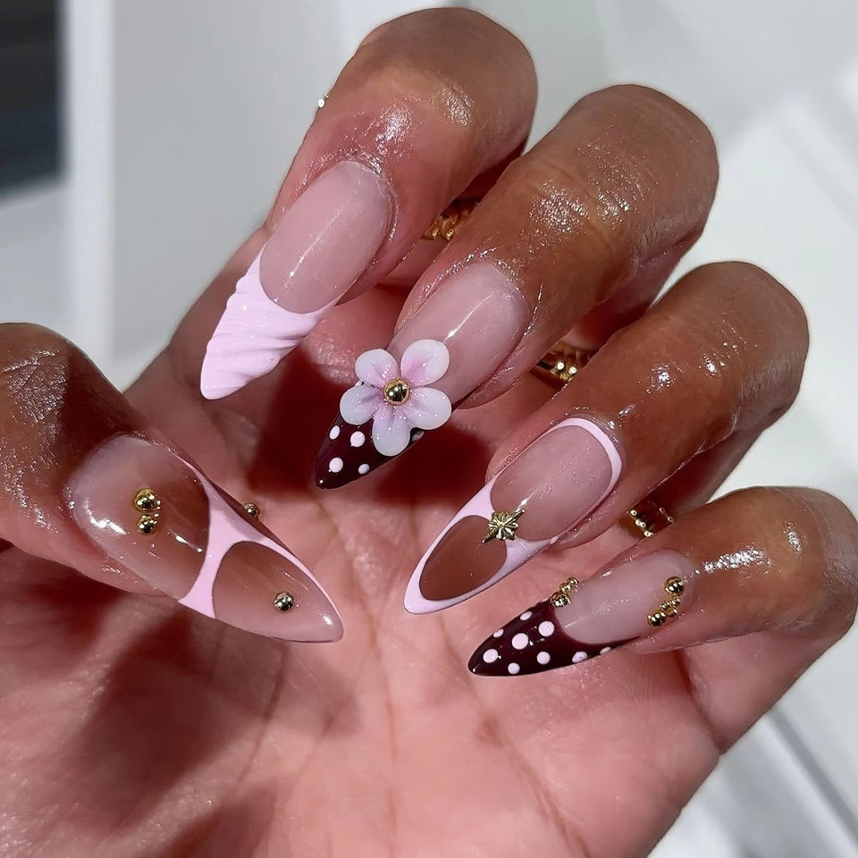 French Polka Chic Almond Press-On Nails with Glue ABS Material Custom Logo OEM/ODM Factory Adhesive Tabs