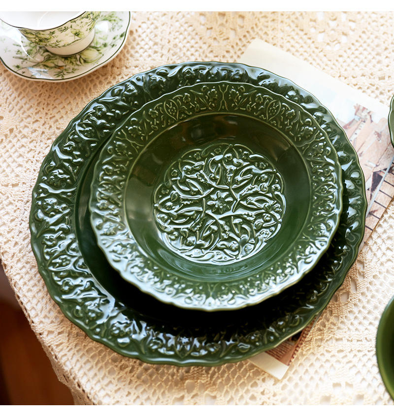 French Retro Mary Dark Green Porcelain Tableware Set Ceramic Dishes Teapot Bowls Hotel Steak Dinner Plates Engraved