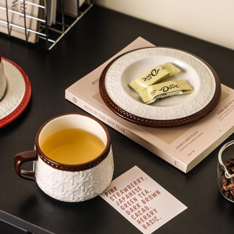 French Retro Rattan Ceramic Coffee Mug and Saucer Set Exquisite Gift Water Cup
