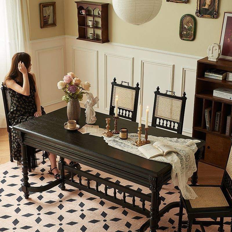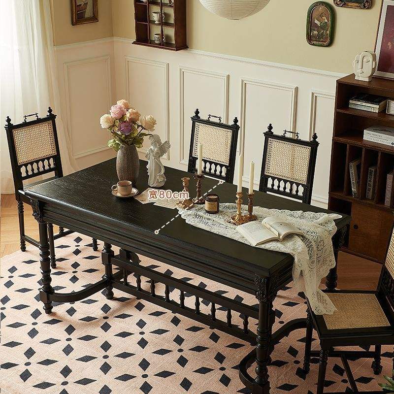French Retro Solid Wood Rectangular Dining Table Black Carved Design Modern Minimalist Style Stable Structure For Home Use