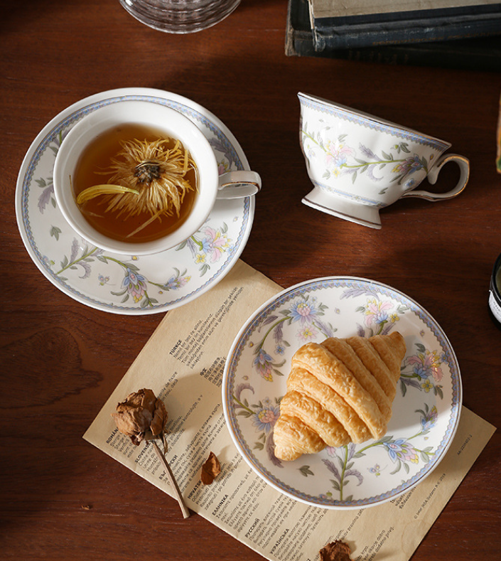 French Romantic Garden Design Purple Lavender Printed Ceramic Cups And Saucers - Ready-To-Ship Set
