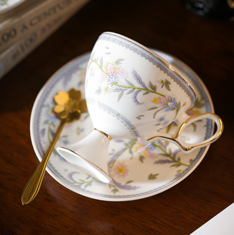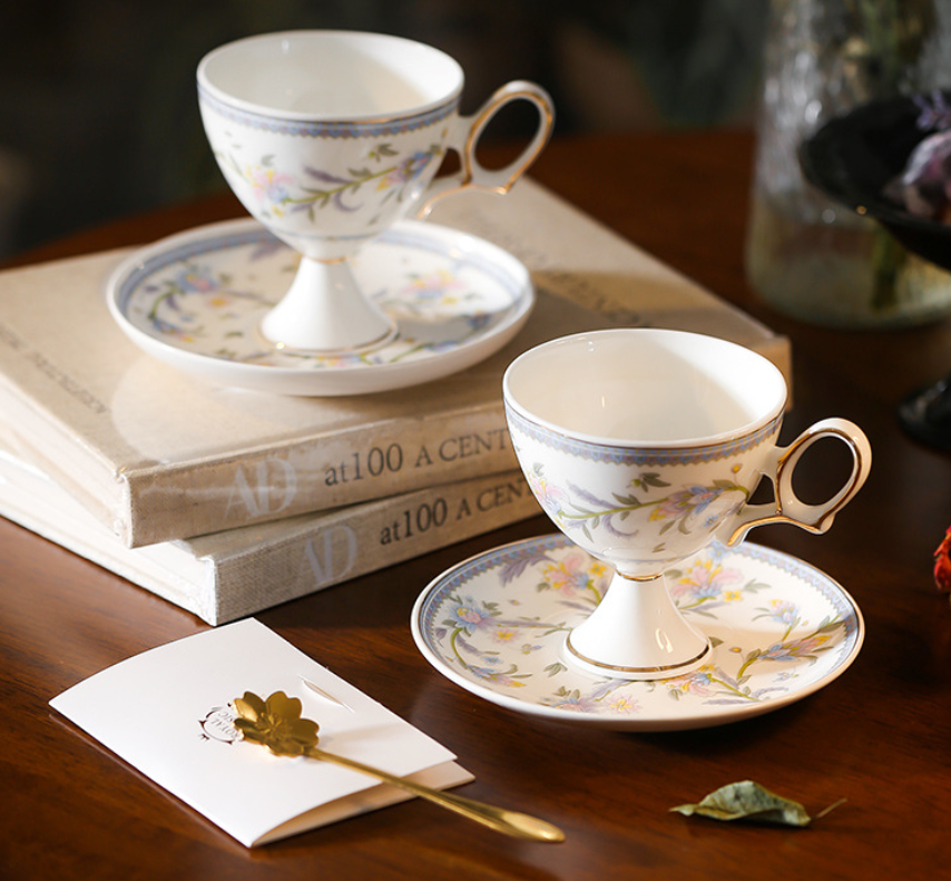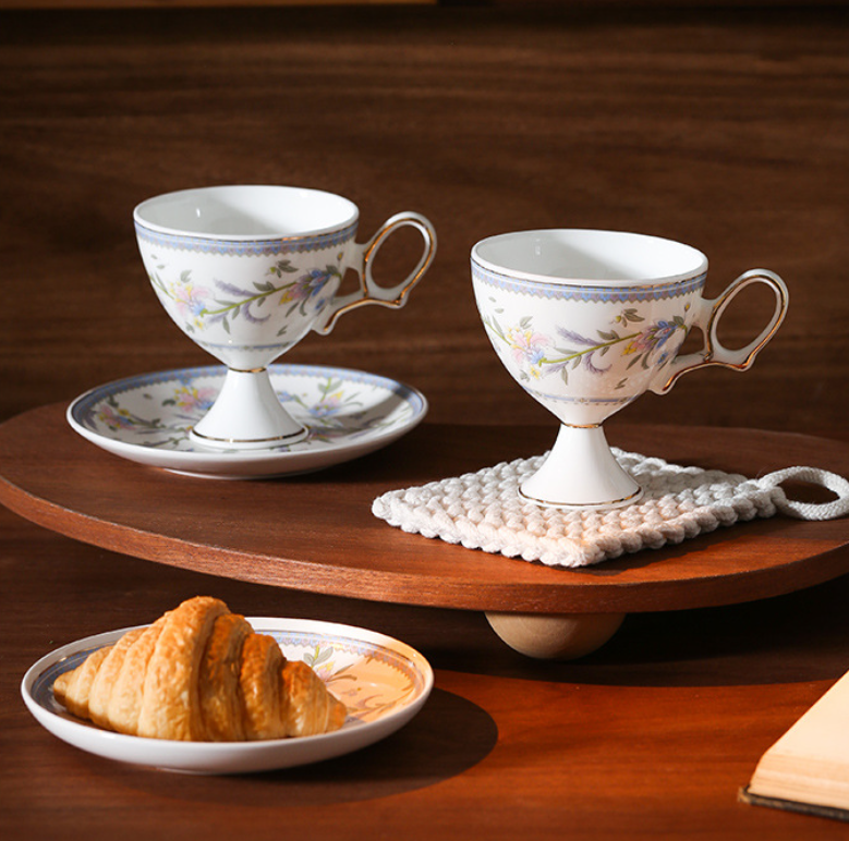 French Royal Style Design Of Elegant And Luxurious Bone China Tall Cups Flower Vine Ceramic Cups And Saucers
