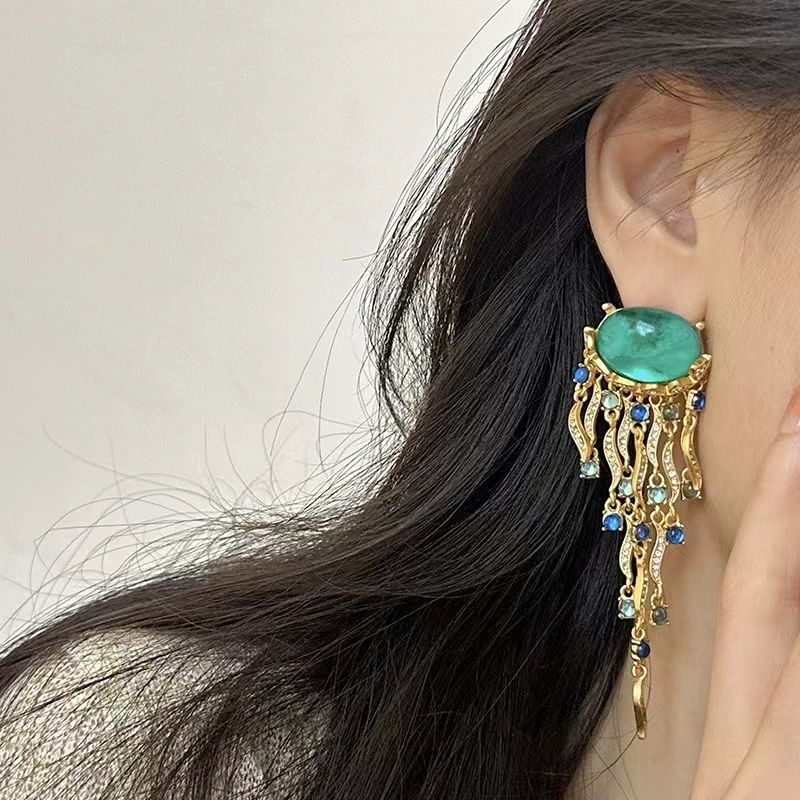 French Style Court Style Earrings Luxury Fashion Women Green Stone Long Drop Tassel Earrings for Banquet
