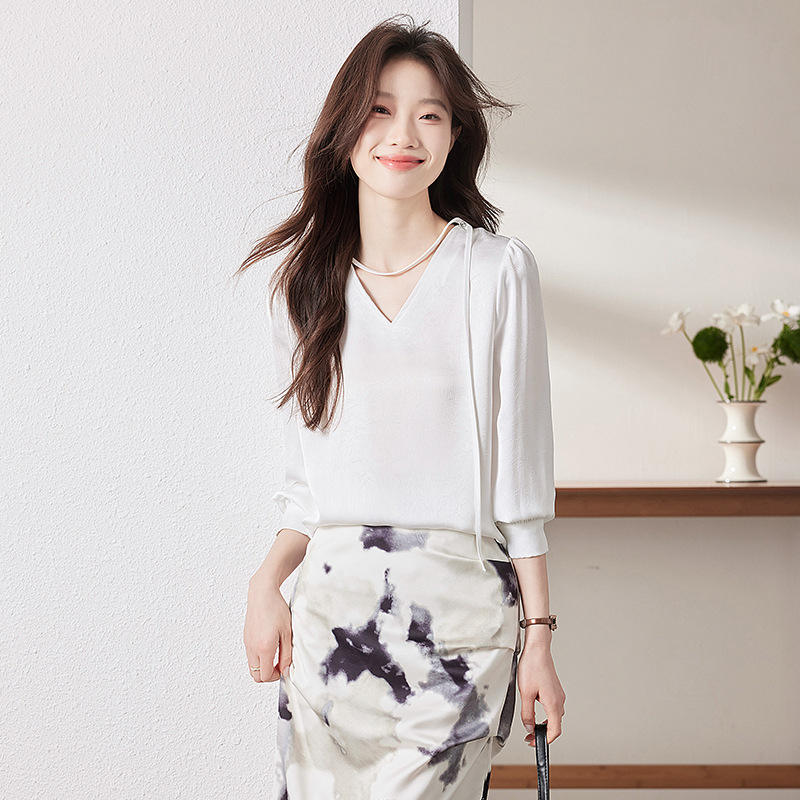 French Style V-neck Ribbon Draped Blouse Women Spring Summer Satin Solid Color Commuting Shirt Q9948