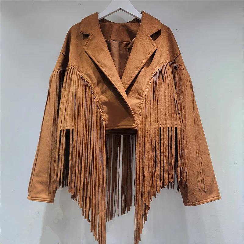 French Style Women's Black Tassel Jacket with 2-Button Sheep Skin Imitation Leather New Design Long Sleeve Loose Fit Collar Suit