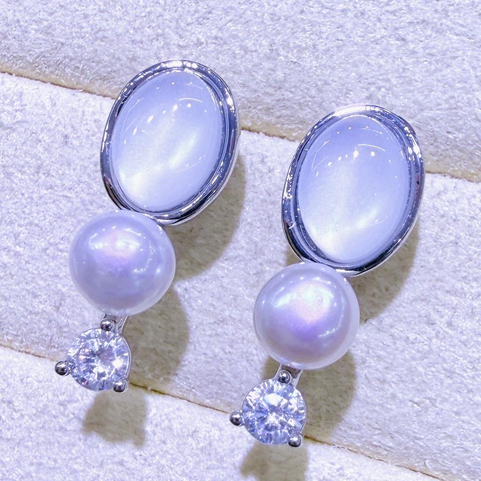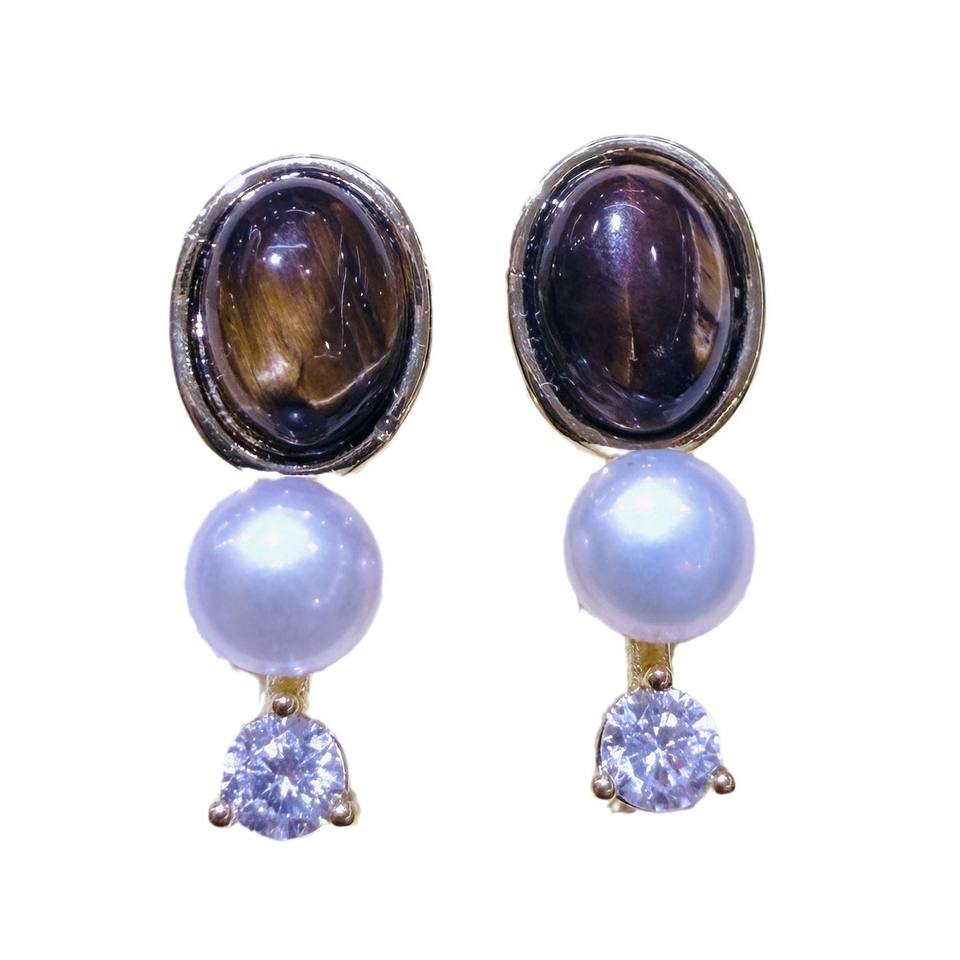 French Tiger Eye Stone White Butterfly Shell Retro Freshwater Pearl Single Zirconium Circular Geometric Fine Dangle Earrings