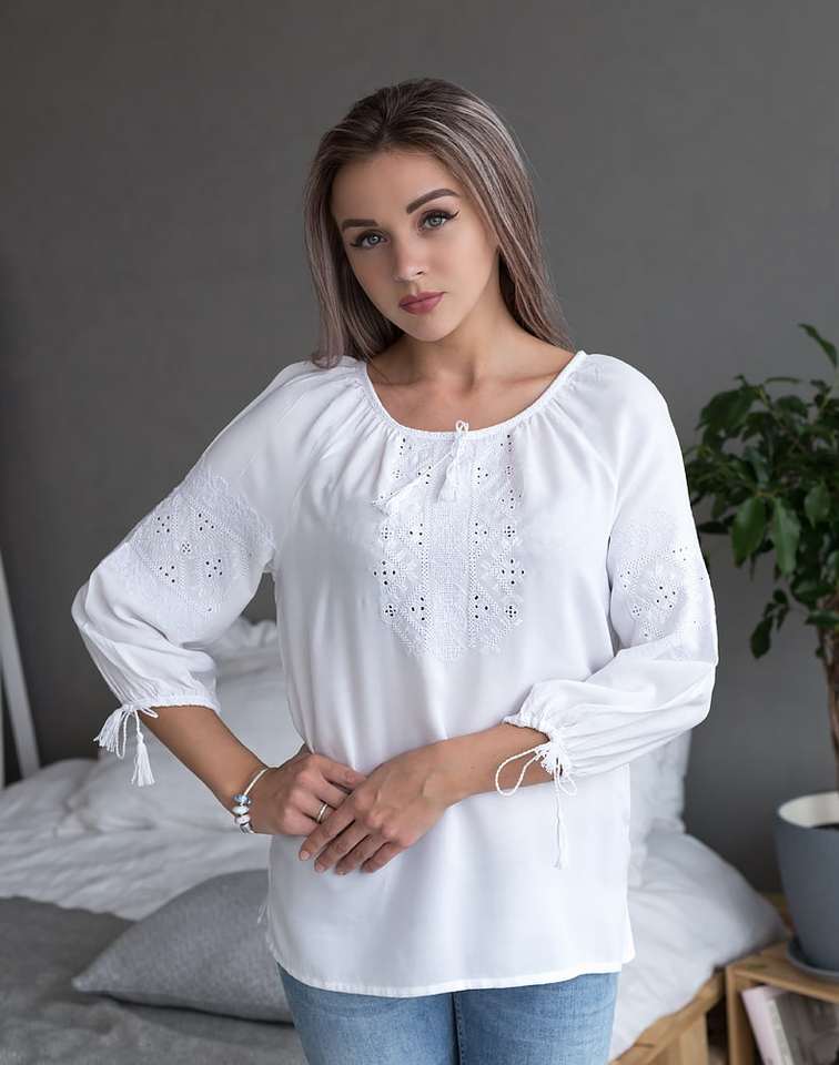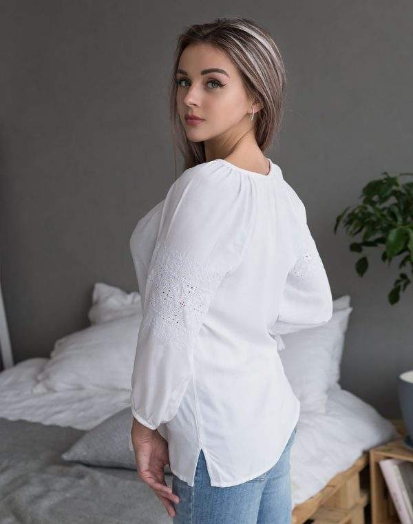 French Women Vintage Blouses Casual Fashion Large/XS White Cotton Shirt with Bishop Sleeve Embroidery Print Design for Parties
