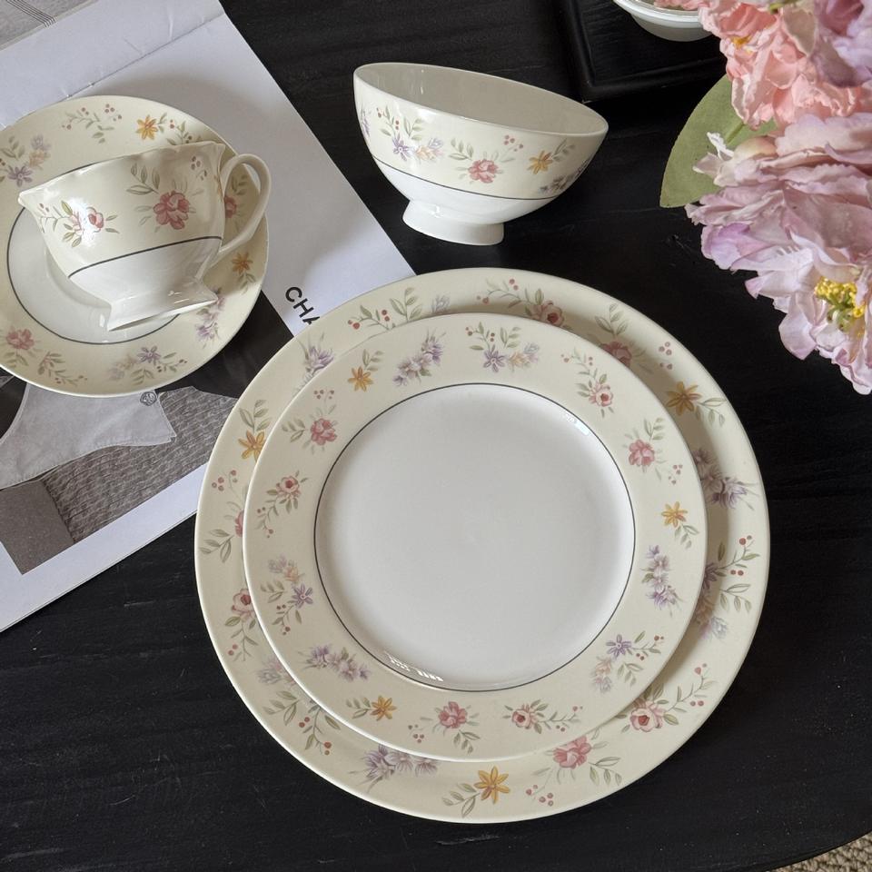 French country retro, South French floral light yellow ceramic bowls and plates, coffee cups and saucers, dessert plates
