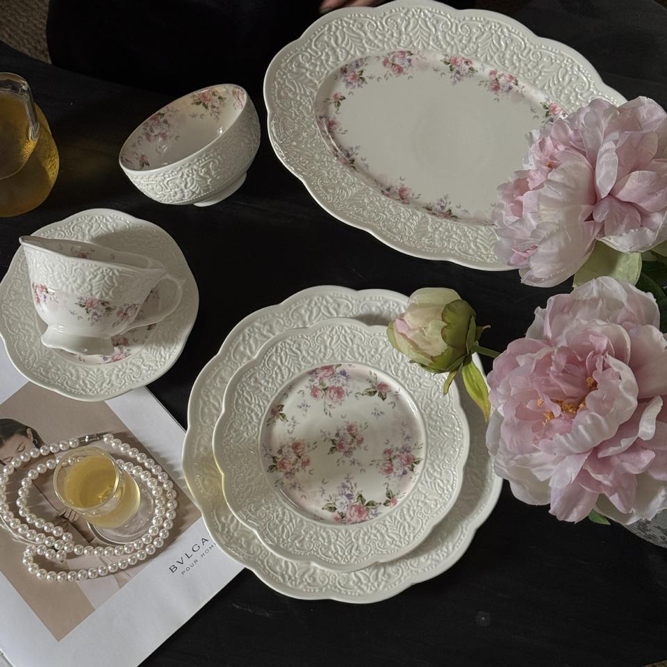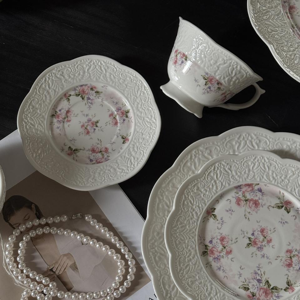 French retro petal-edge relief ceramic pure white tableware, dessert, breakfast, salad plates, coffee cups and saucers