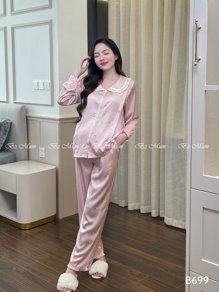 French silk pajamas for pregnant women ruffled collar soft cool printed pattern B699 breathable wholesale price