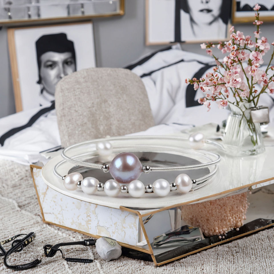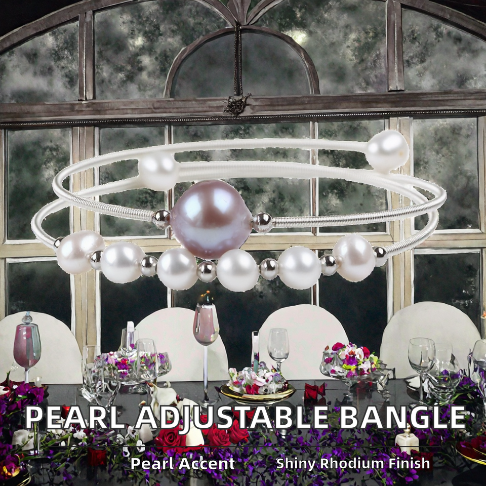 Freshwater Pearl Adjustable Cuff Bangle - Rhodium Plated Silver Wrapped Ethnic Opening Bracelet for Women