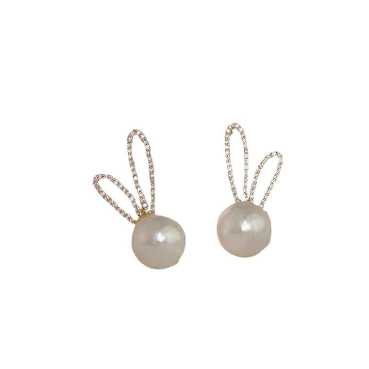 Freshwater Pearl Stud Earrings with Korean Celebrity Style Gold Rabbit Ear Inlaid New Fashion with Gold Accent