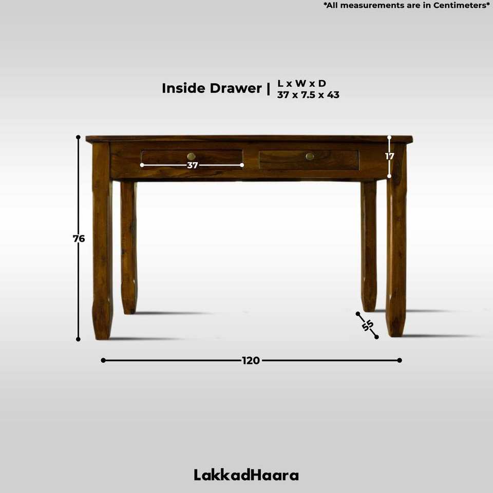 Dimensions (Cms):L: 120 x D: 55 x H: 76 Cms (Table) & L: 37 x D: 43 x H: 7.5 (Drawer)