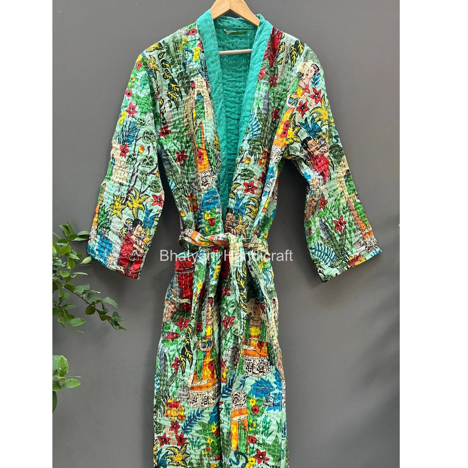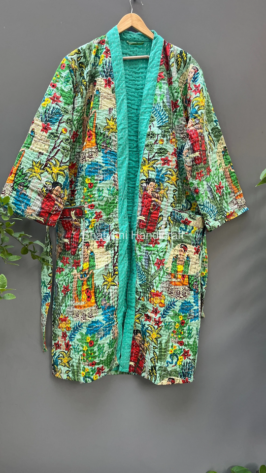 Frida Khalo Inspired Vintage Indian Kantha Jacket Long Quilted Cotton Robe Dressing Gown XL Size for Winter