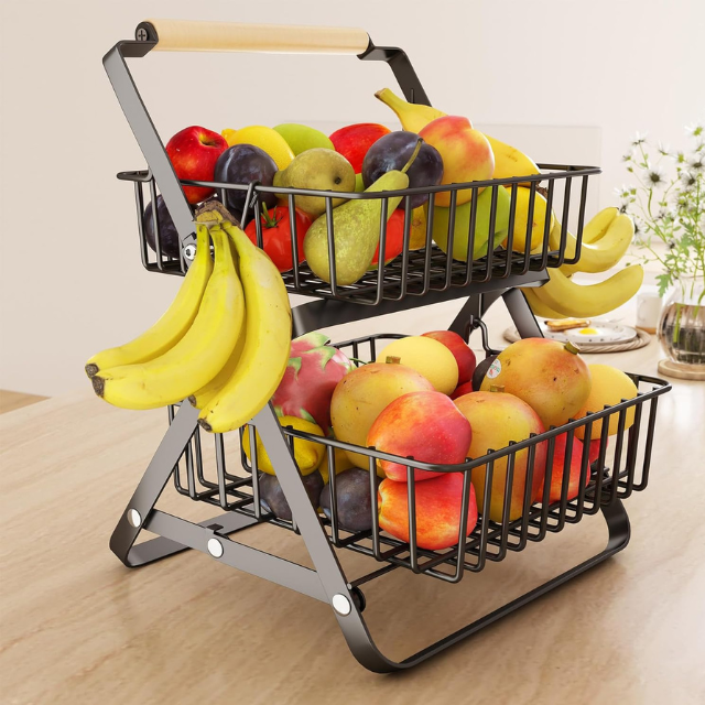 Fruit Basket Stand for Kitchen Counter - 2 Tier Metal Fruit Bowls with Banana Holder, Black