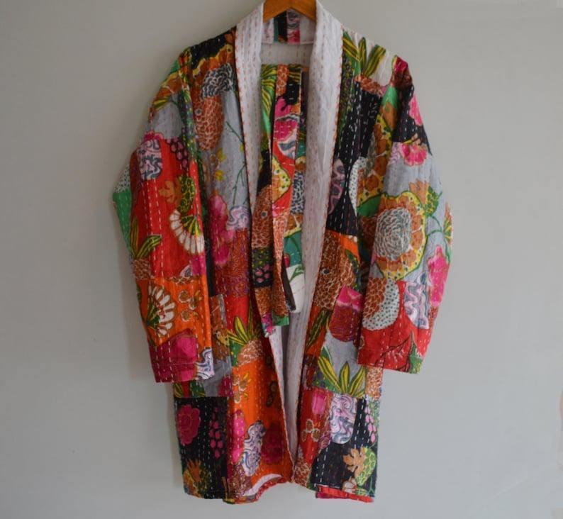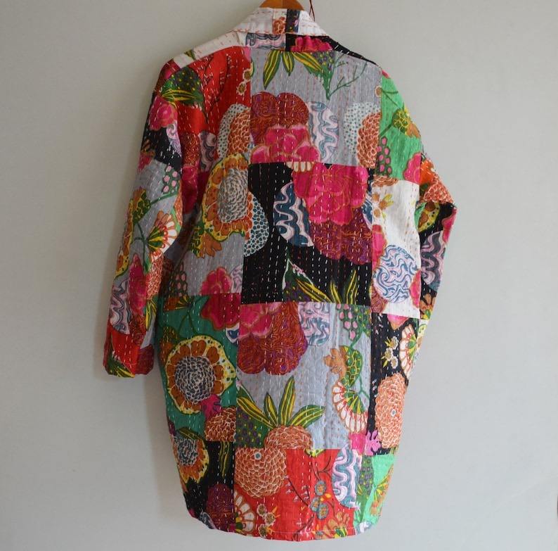 Fruit Patch Print Kantha Jacket Front Open Jacket Japanese Kimono Style Beach Wear Bohemian Kantha Robe Winter Jacket Boho Coat